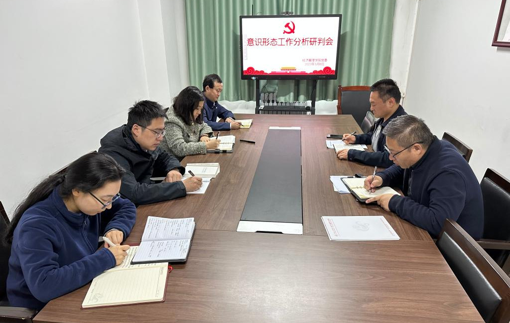 会议强调,意识形态工作是党的一项极端重要的工作,事关党的前途命运和国家长治久安,高校是意识形态工作的前沿阵地,肩负着培养社会主义事业合格建设者和可靠接班人的历史使命,学院党委要充分认识抓好意识形态工作的重要性,旗帜鲜明地站在意识形态工作第一线,紧扣立德树人根本任务,全面贯彻党的教育方针,坚持社会主义办学方向,为党育人,为国育才。一是认真落实意识形态工作责任制,牢牢掌握意识形态工作领导权、管理权、话语权,突出问题导向,聚焦薄弱环节,明确目标,细化任务,强化措施,狠抓落实;二是切实加强和改进师生思想政治教育,用习近平新时代中国特色社会主义思想和党的创新理论武装师生头脑;三是主动深入师生,及时了解和掌握师生思想动态,做好教育引导和心理疏导,切实解决师生关心的热点和难点问题,化解矛盾,消除风险,为学院事业高质量发展提供坚强的政治保证;四是加强学院意识形态工作阵地建设和管理,弘扬主旋律,传播正能量,积极营造风清气正、健康向上的校园文化氛围;五是加强网络意识形态工作,提高师生网络素质和法治意识,加强网络舆情监测,做好网上正面宣传和舆论引导,防范网络意识形态风险。(文/刘菁怡 图/贾宇阳 审核/郝晓炜)