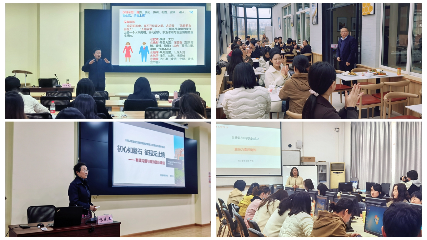 培训邀请校党委宣传部部长冯飞龙教授、学院管理系袁春云副教授、芦蕊副教授分别作了主题为《高校青年教师师德师风建设与行为礼仪规范》《“初心如磐石,征程无止境”有效沟通与高效团队建设》《胜任力素质测评》的报告。