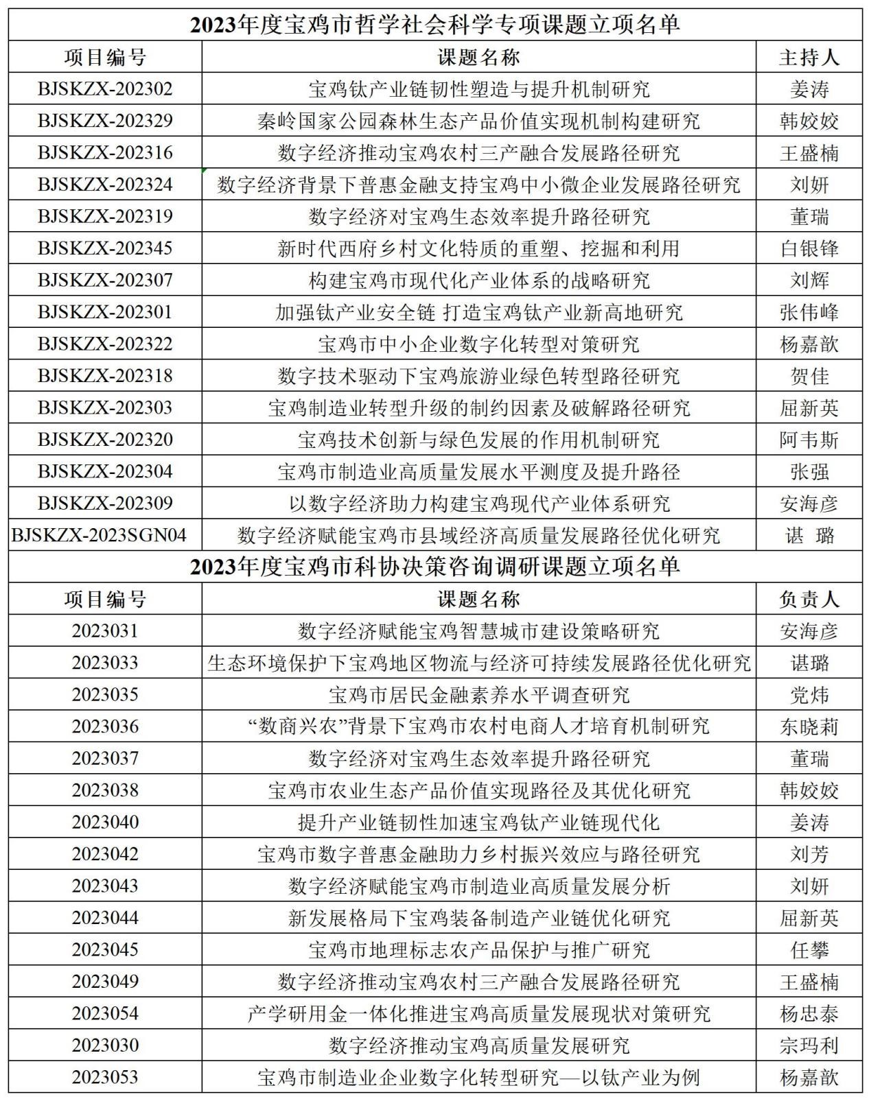近日,best365官网登录入口教师共获批30项2023年度宝鸡市专项课题,其中宝鸡市哲学社会科学工作领导小组办公室公布了2023年宝鸡市哲学社会科学专项课题立项名单,best365官网登录入口教师共获批15项;宝鸡市科学技术协会工作领导小组办公室公布了2023年宝鸡市科协决策咨询调研课题立项名单,best365官网登录入口教师共获批15项。课题立项后,根据完成情况及结项评审等次,拨付数额不等的资助经费。(best365官网登录入口 文/韩姣姣 审核/杨嘉歆)