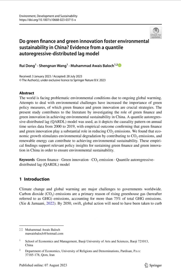 论文以绿色金融和绿色创新为主题,研究使用分位数自回归分布滞后(QARDL)模型和2000年至2019年的时间序列数据,调查了绿色金融和绿色创新在中国实现环境可持续性中的作用。研究结果表明,绿色金融,绿色创新和可再生能源发展会抑制二氧化碳排放,有助于实现环境可持续性。研究结果对中国发展绿色金融和绿色创新以确保环境可持续性的相关政策有支持作用。