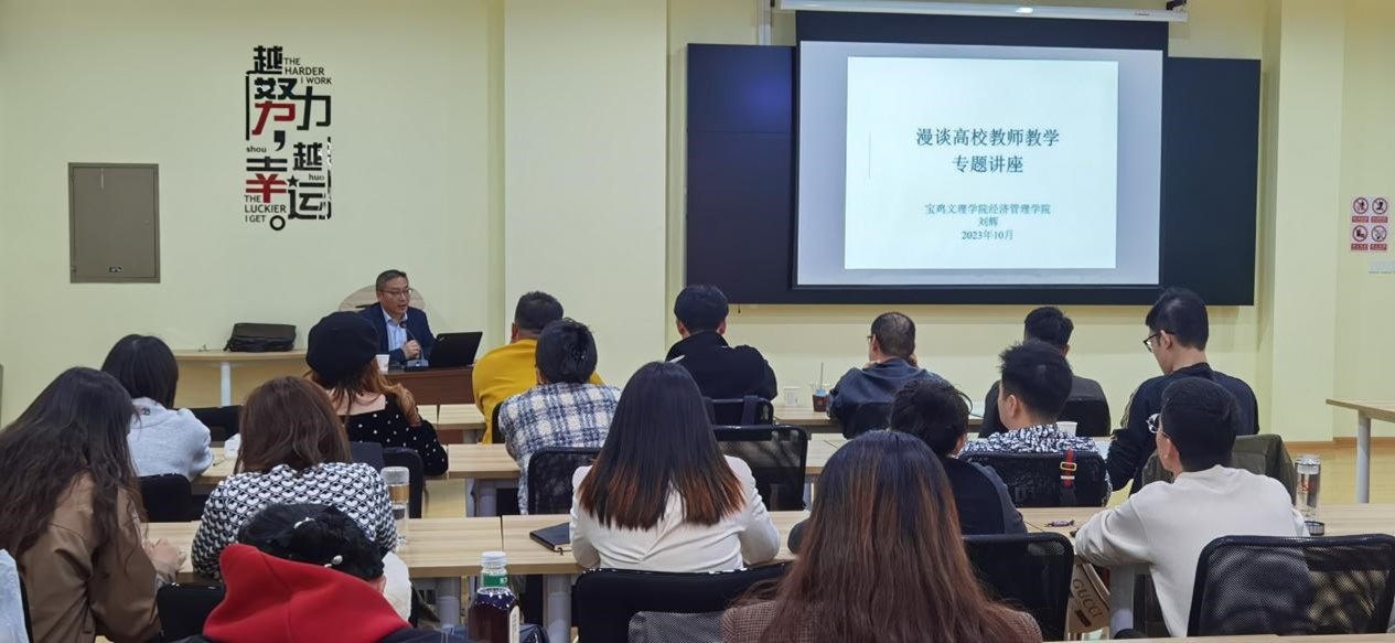 第四板块,漫谈高校青年教师课堂教学。刘辉结合自身从教十七年的经验体会,他勉励新进教师首先得过教学关,站稳讲台。从课堂教学的核心环节入手,重点分享了备课、板书、多媒体运用、与学生互动、教学改革研究等方面的经验。整场讲座,刘老师和新进教师拉家常式交流,为青年教师克服胆怯、勇做课堂主人树立了信心,指明了努力方向。