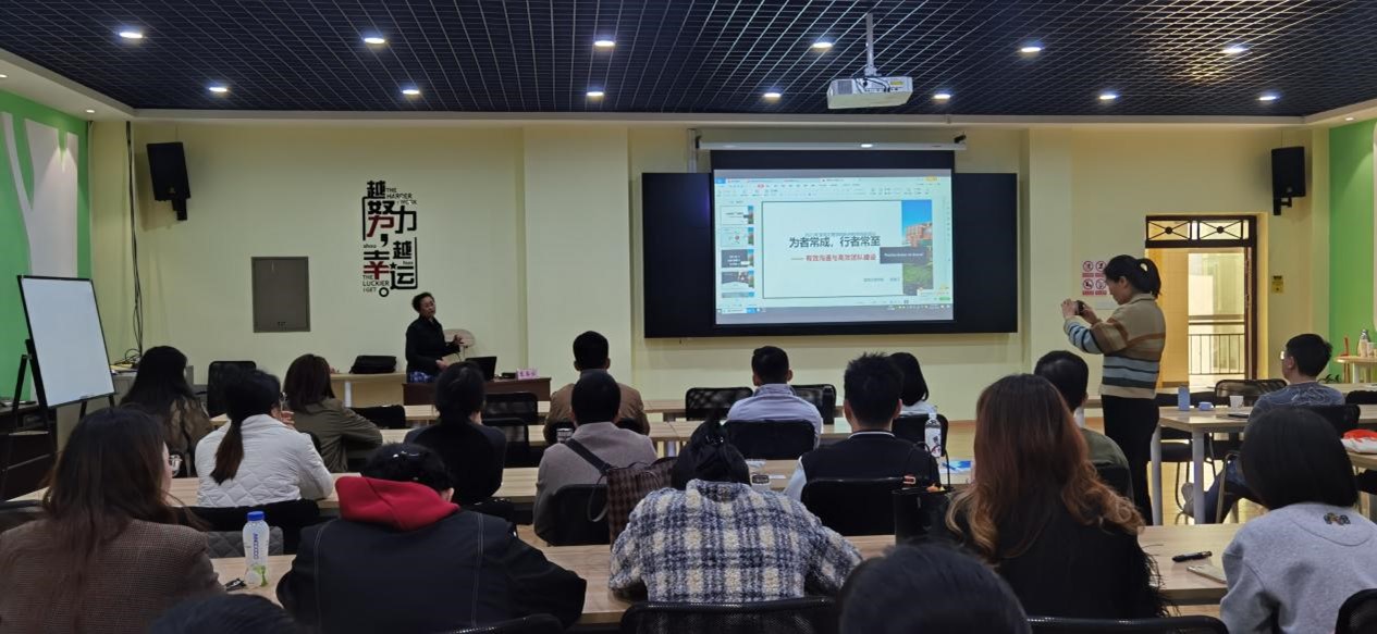 全天培训共分为五个板块。上午由袁春云老师带来主题为“为者常成,行者常至”的有效沟通与高效团队建设培训。以拓展游戏开场,通过学员的积极参与和体验,激发反思总结,并最终带入培训主题。袁老师从工作、有效沟通、团队等三个方面,通过丰富案例,提升学员对高校职业和职业生涯规划的认知水平,深入浅出地指出有效沟通和团队凝聚力的重要性及其塑造提升路径。