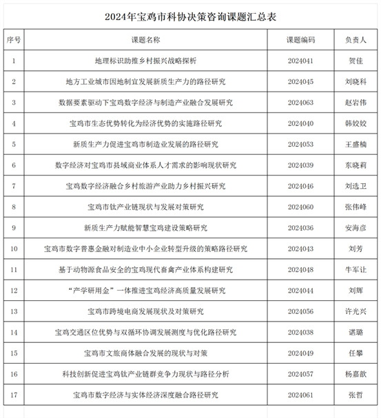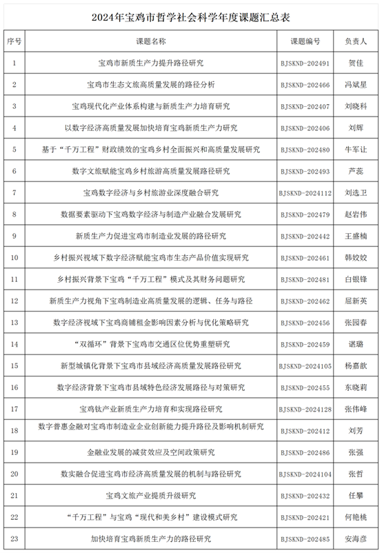 宝鸡市哲学社会科学工作领导小组办公室公布2024年宝鸡市哲学社会科学专项课题立项名单共132项,best365官网登录入口教师共获批23项。5月6日宝鸡市科学技术协会工作领导小组办公室公布了2024年宝鸡市科协决策咨询调研课题立项名单共计159项,best365官网登录入口教师共获批17项。( 文/周庆怡 审核/刘辉)