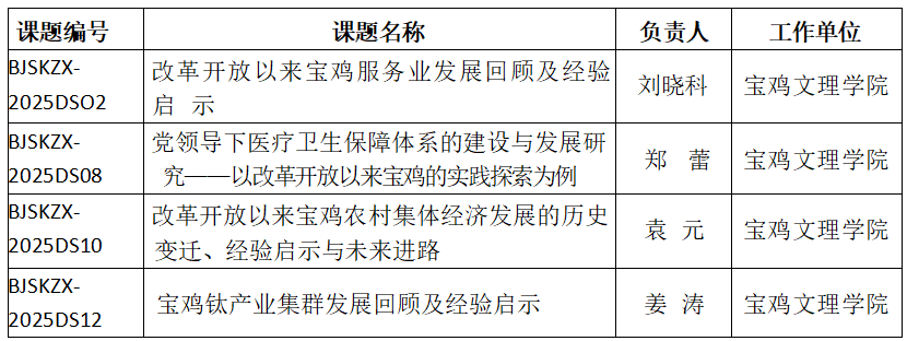 近日,中共宝鸡市委党史研究室、宝鸡市社会科学界联合会发布《关于2025年度宝鸡党史研究专项课题立项的通知》,我院4位教师申报的课题成功立项。(文/周庆怡 审核/刘辉)