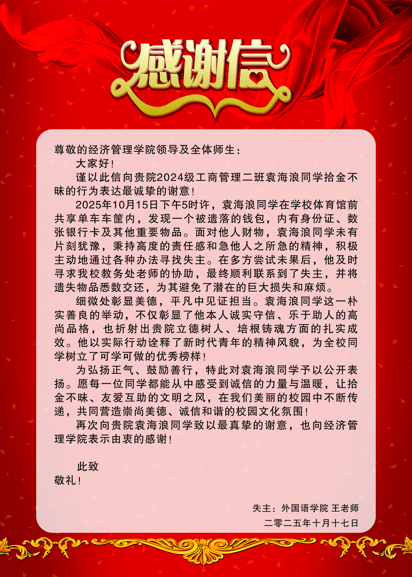 best365官网登录入口2024级工商管理2班袁海浪收到感谢信