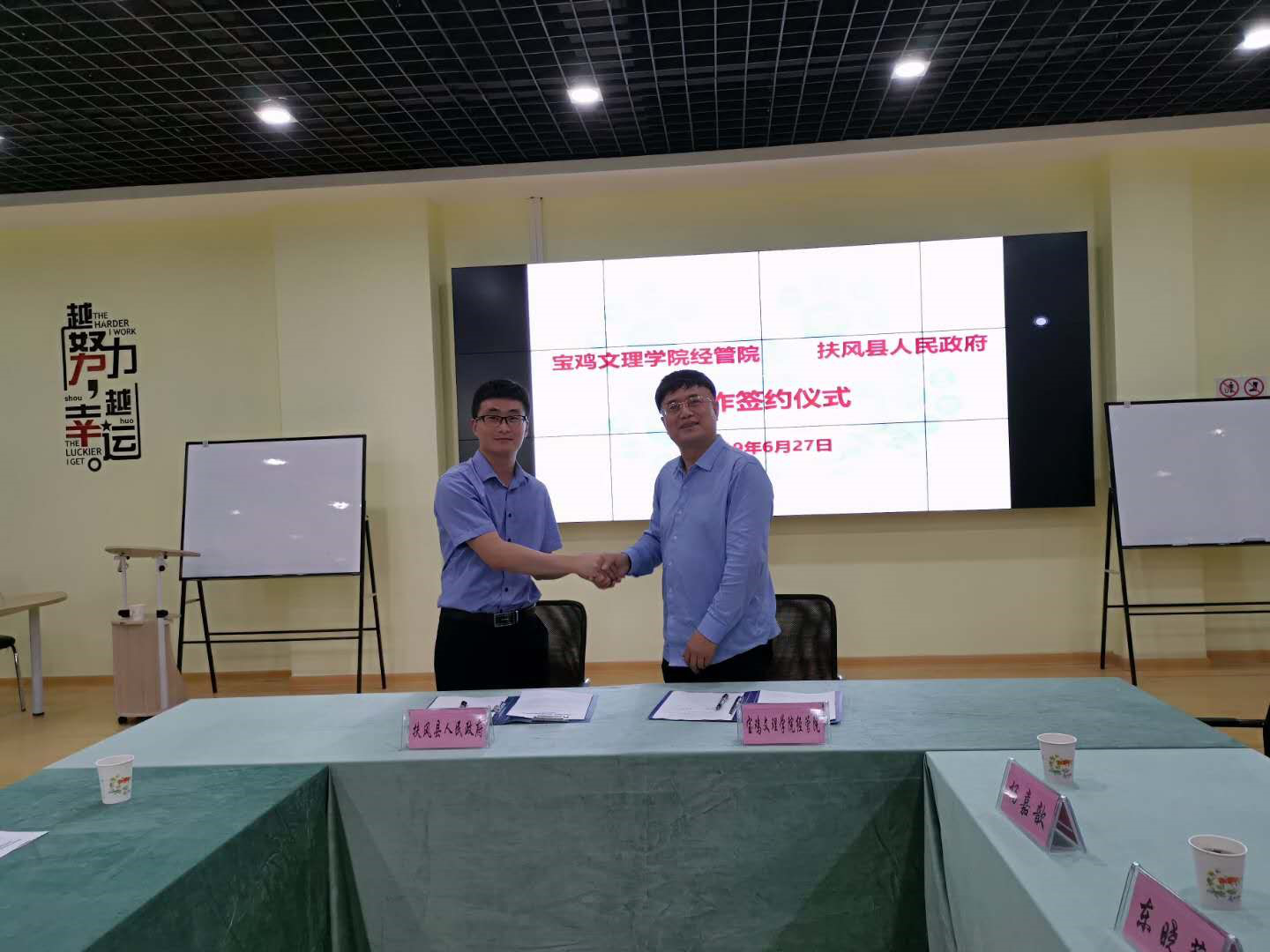 6月27日,best365官网登录入口与扶风县人民政府在我校尚能楼创新创业实验室举行电子商务校地合作协议签署仪式。宝鸡市商务局副局长李小平、扶风县人民政府副县长赵炳震、扶风县电子商务服务中心王丽娟、best365官网登录入口院长张伟峰、副院长刘晓科、工商管理系主任郑蕾以及部分教师代表参加签约仪式。仪式由学院副院长刘辉主持。