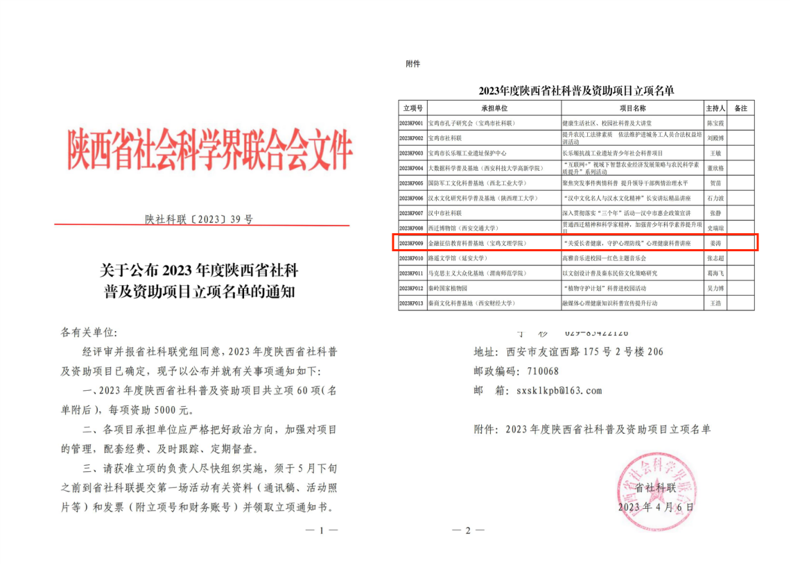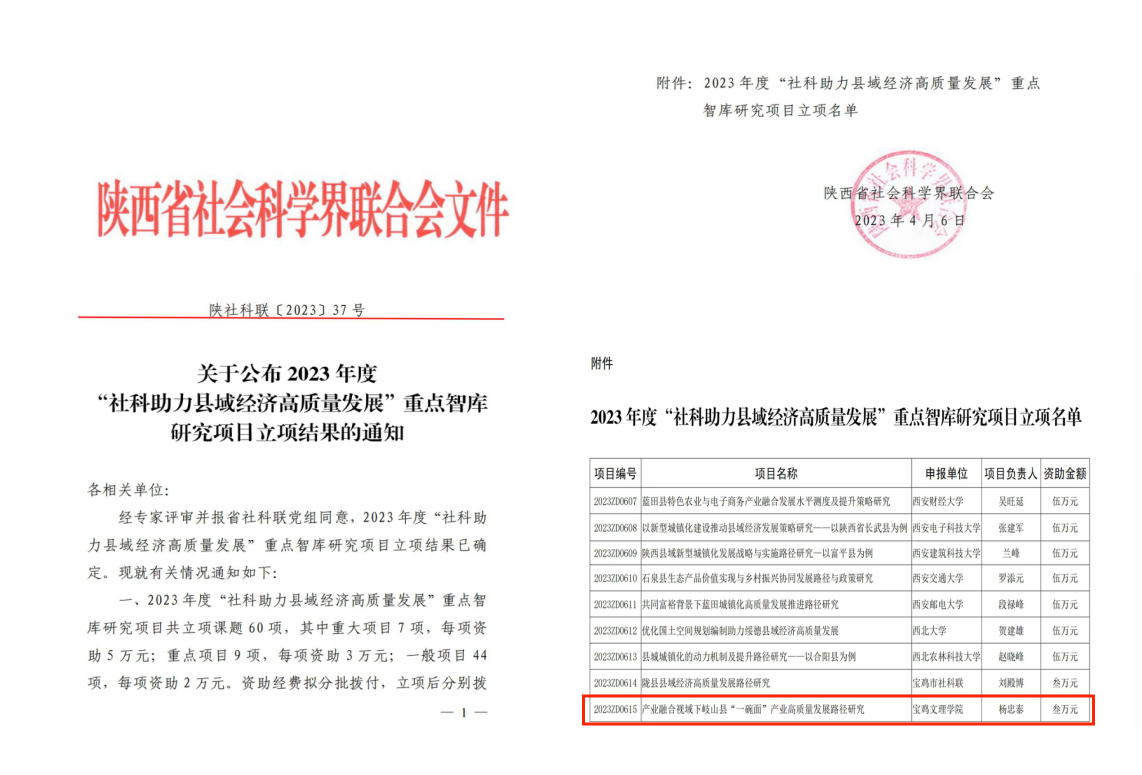 4月6日,陕西省社会科学界联合会公布2023 年度“社科助力县域经济高质量发展”重点智库研究项目立项结果的通知,best365官网登录入口杨忠泰教授申报的《产业融合视域下岐山县“一碗面”产业高质量发展路径研究》获得重点项目立项;陕西省社会科学界联合会公布2023年度陕西省社科普及资助项目立项的通知,best365官网登录入口姜涛副教授申请的《“关爱长者健康,守护心理防线”心理健康科普讲座》获得项目立项。best365官网登录入口将以此为契机,践行“崇术重用 服务地方”理念,强化学术研究和科学普及工作,为地方社会经济发展建言献策,为陕西哲学和社会科学发展做出贡献。(文/任攀 审核/杨嘉歆)